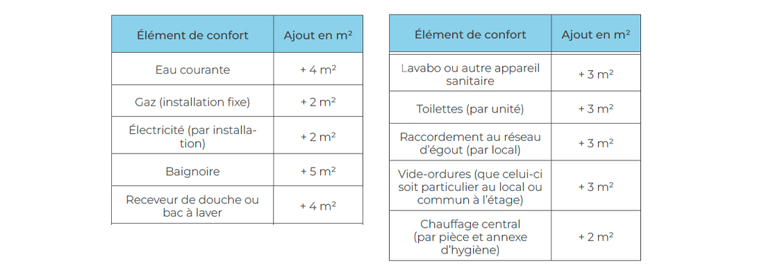 En plus des surfaces, les « éléments de confort » du bien sont également pris en compte. L’administration fiscale attribue à chaque élément de confort une équivalence en mètres carrés, qui vient s’ajouter à la surface pondérée.